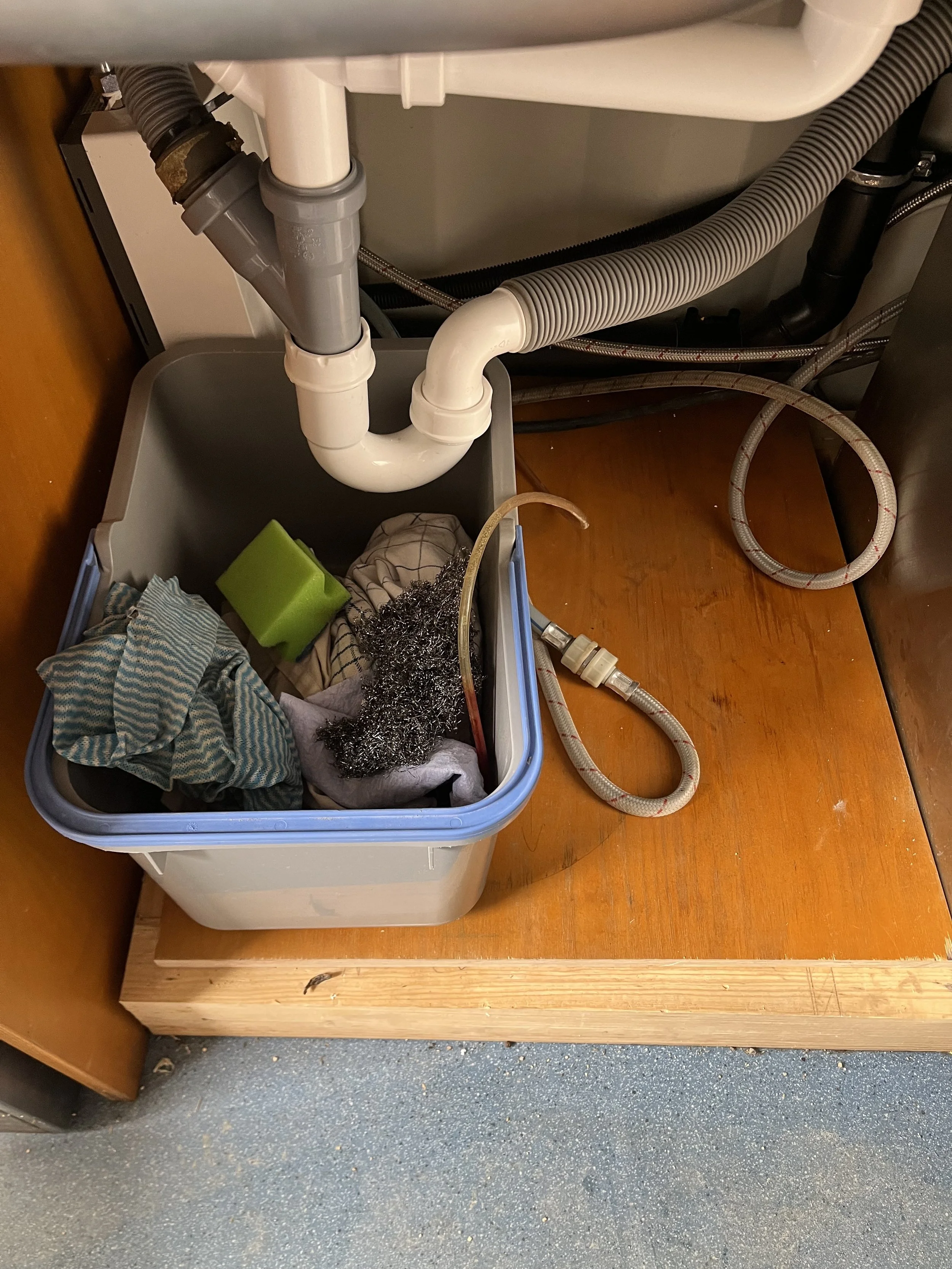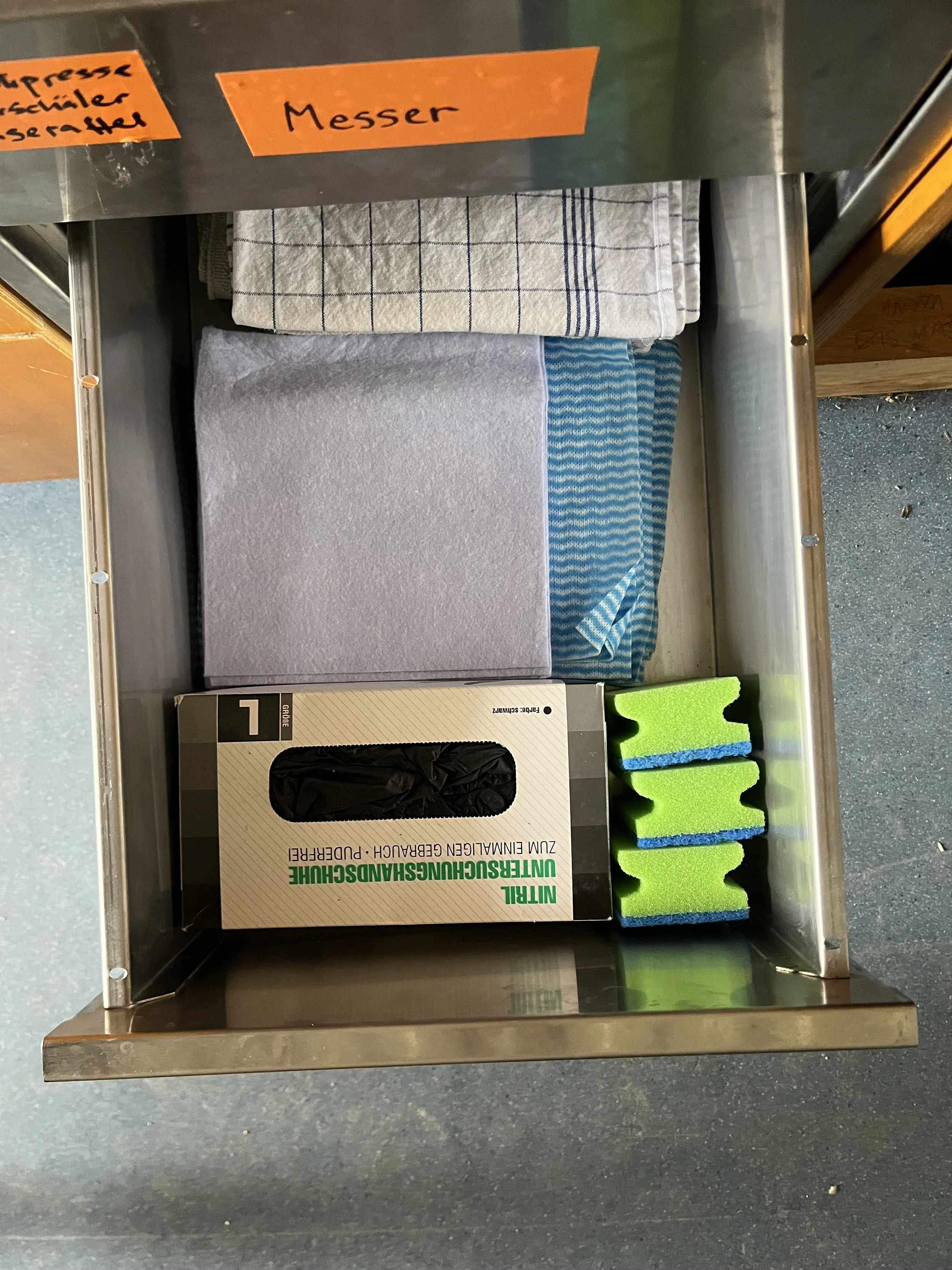 Küche: Saubere Lappen und Geschirrtücher befinden sich in einer der Schubladen. Alle benutzten Lappen und Geschirrtücher in den vorgesehenen Eimer unter der Spüle räumen.